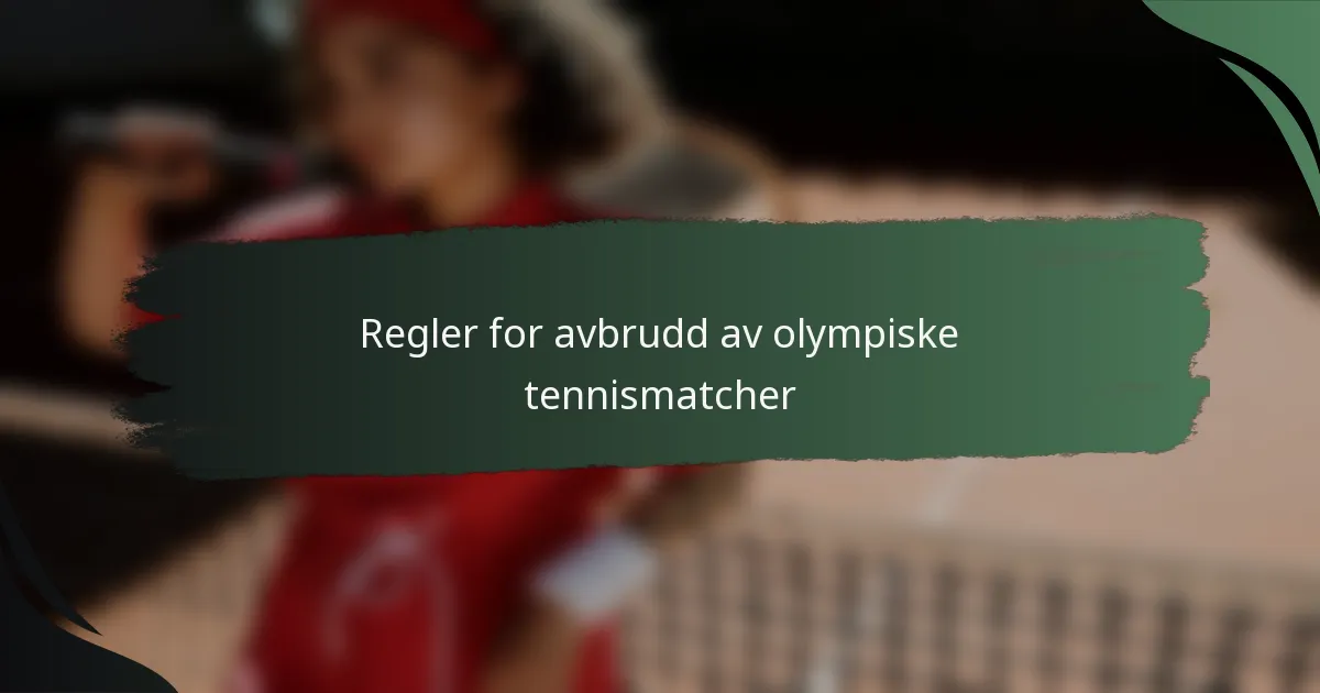 Reglene for avbrudd i olympiske tennismatcher beskriver betingelsene under hvilke spillet kan pauses, og sikrer rettferdighet og integriteten til konkurransen. Disse reglene skiller seg fra de i Grand Slam- og ATP/WTA-turneringer, og tilbyr større fleksibilitet og tar hensyn til unike forhold som vær og publikumsengasjement. Avbrudd kan oppstå av ulike faktorer, som påvirker både matchdynamikken og opplevelsene til spillere og tilskuere.